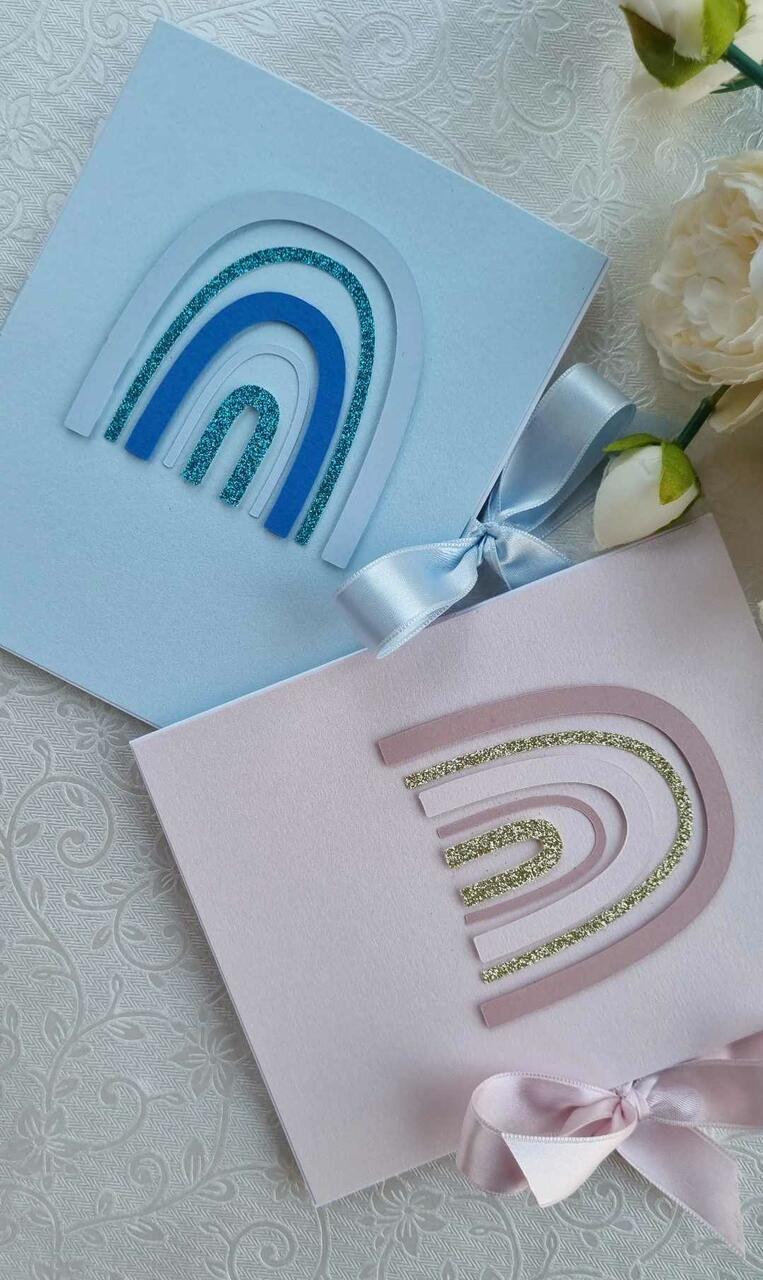 Roosades ja sinistes toonides vikerkaare kujundiga käsitööna valminud õnnitluskaart.