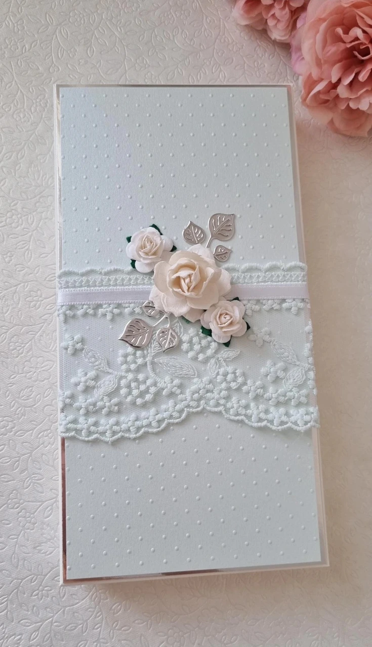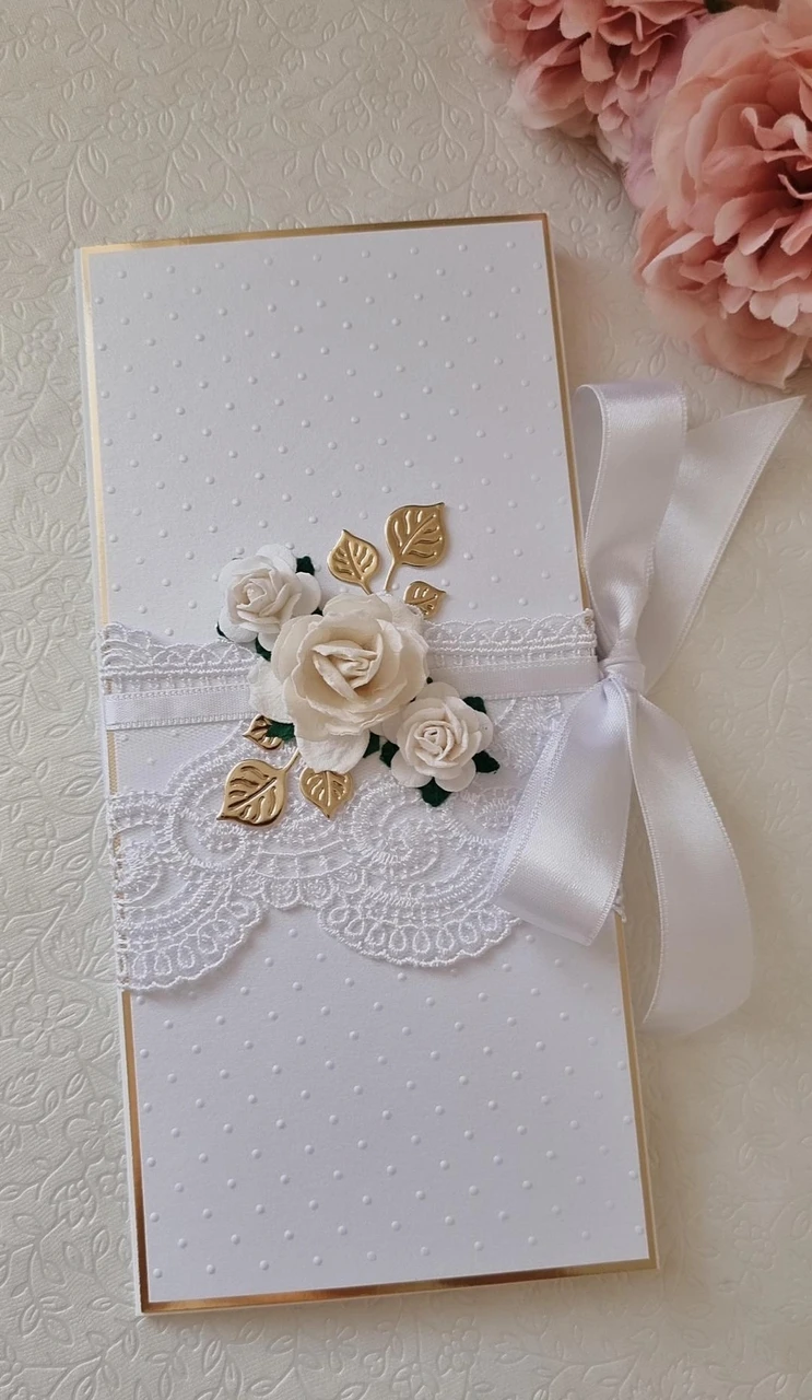 Rahakaart ja karp on kaunistatud valget tooni metallikläikega kartongist ja peegelkuldsest kartongist. Käsitöökaarti kaunistab pits, lilled, õielehed ja valge pael, millega saab kaardile ilusa lipsu siduda.