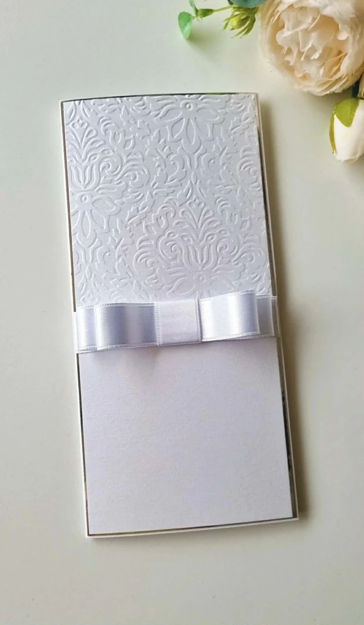 Kaart avaneb kolmeks osaks, kus on piisavalt ruumi teksti kirjutamiseks või meie poolt prinditud õnnesoovide lisamiseks.Kaarti kaunistab elevandiluuvalgest, roosast või valgest paelast elegantne lips.