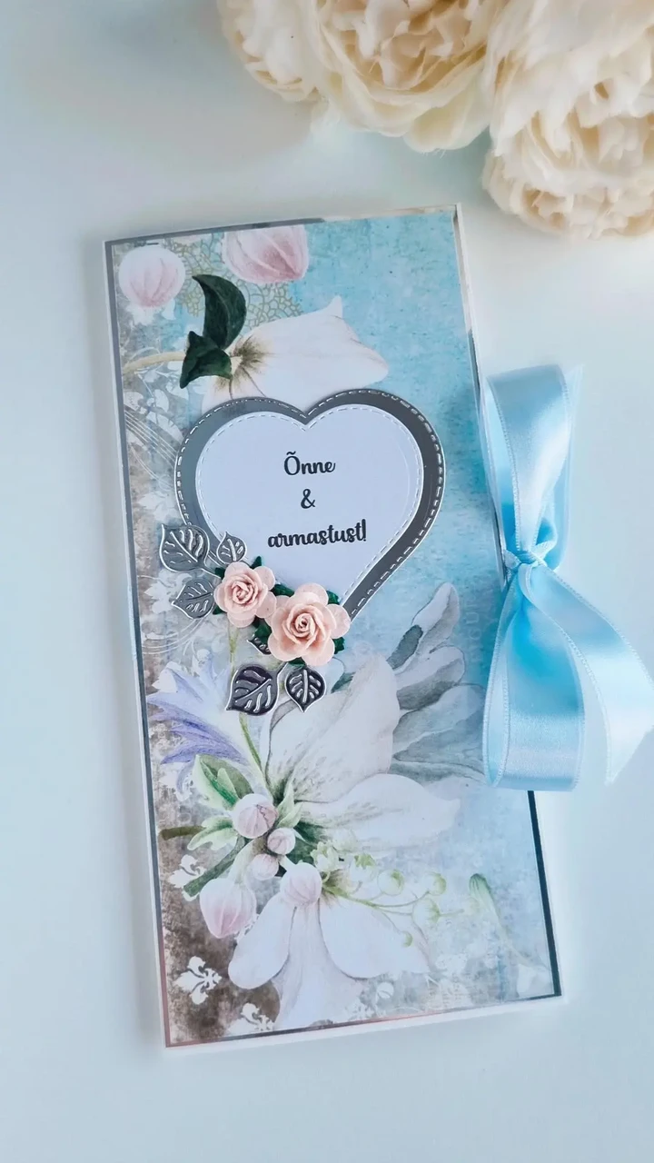 Kauni disainpaberiga kaunistatud rahakaart pulmadeks. Valikus on 3 erinevat disaini. Käsitöökaarte kaunistavad erinevad detailid ja kaunistused.