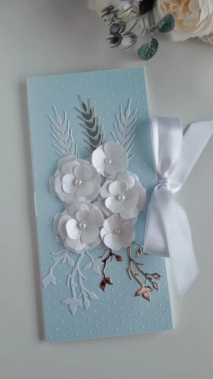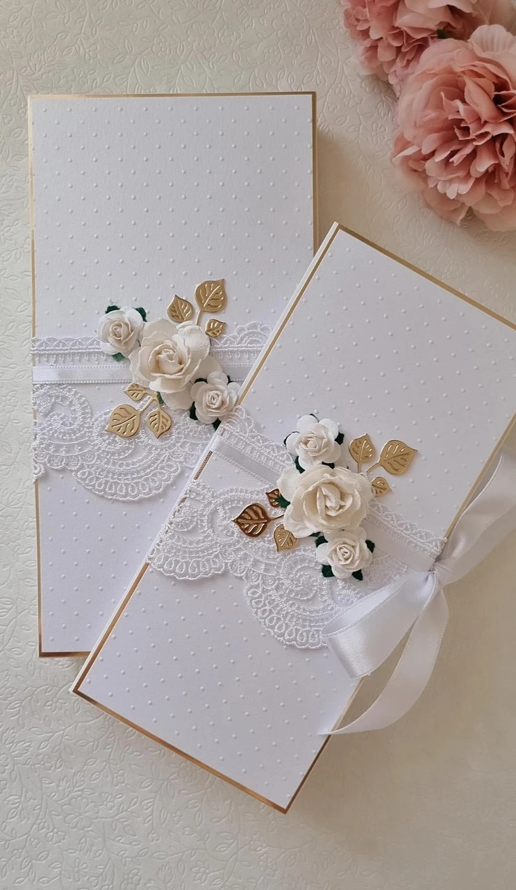 Luksuslik käsitööna valminud rahakaart, mis sobib väga hästi pulmadeks kinkida. Kaart avaneb kolmeks osaks ja kaardi sees on piisavalt ruumi teksti kirjutamiseks.Käsitöökaarti kaunistavad valged/helekuldsed pärlmutter läikega käsitöölilled, peegelhõbedased/peegelkuldsed ja valged/helekuldsed oksakesed ja viljapead. Täpsemaid disaine vaata galeriist. Lumivalgest/elevandiluuvalgest või heleroosast atlaspaelast saab pulmakaardile siduda kauni lipsu. Vaata täpset kaardi värvide kooslust pildigaleriist.